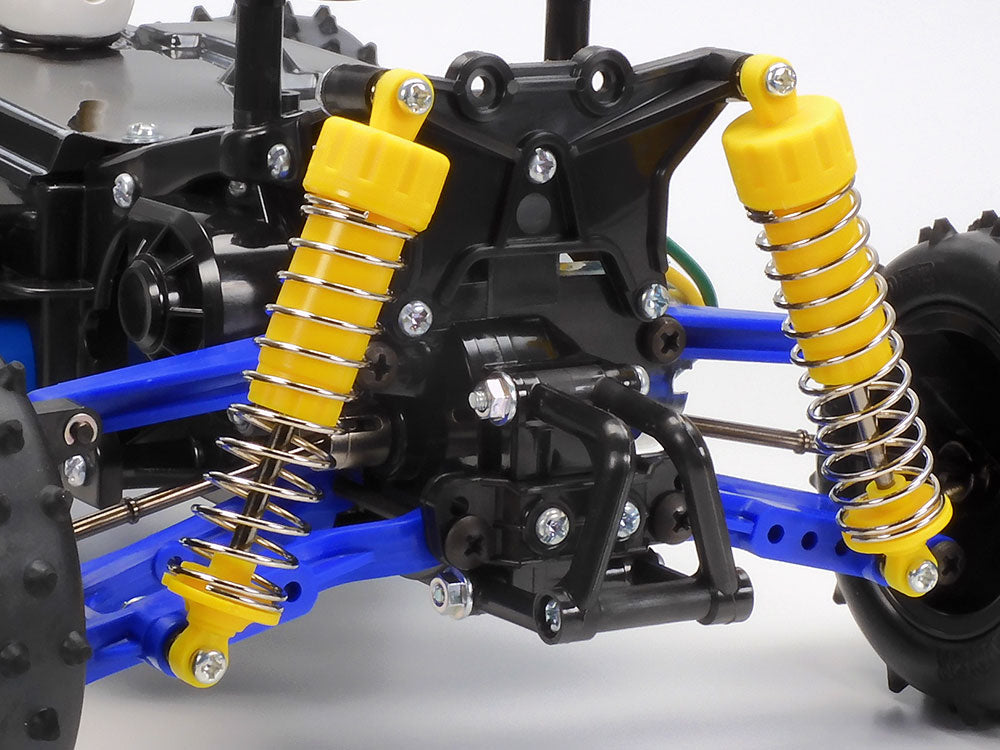 The chassis features a shaft-driven 4WD drivetrain married to a lightweight and tough bathtub frame that employs front and rear gearboxes with the suspension attached to them; that suspension utilizes upper "I" and lower "H" arms, and offers a ground-hugging drive. CVA oil dampers and a front stabilizer contribute further to an excellent drive. Both gearboxes house a gear differential, and are compact to ensure plentiful ground clearance. The kit also features an aluminum motor mount for superior heat dissipation.