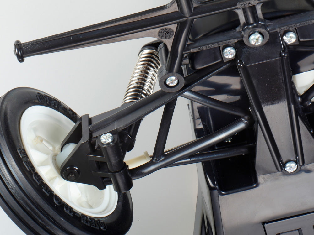 This re-release version of The Grasshopper II R/C off-road car assembly kit features a number of updates while keeping largely to the design of the original released in 1988. It includes a highly realistic injection molded polystyrene resin body, marking stickers and a driver figure. The chassis' streamlined construction and use of a Type 380 motor makes the kit perfect for less experienced users. It is compatible with separately sold race spec Hop-Up Option parts such as Type 540 motors and CVA oil dampers.