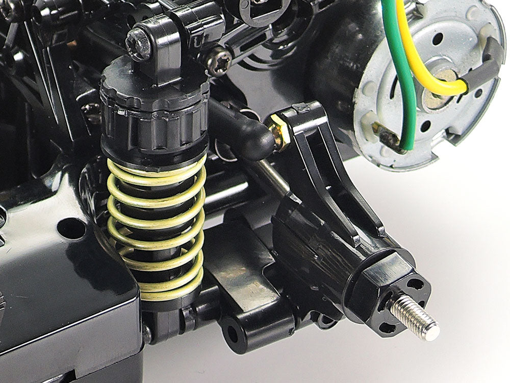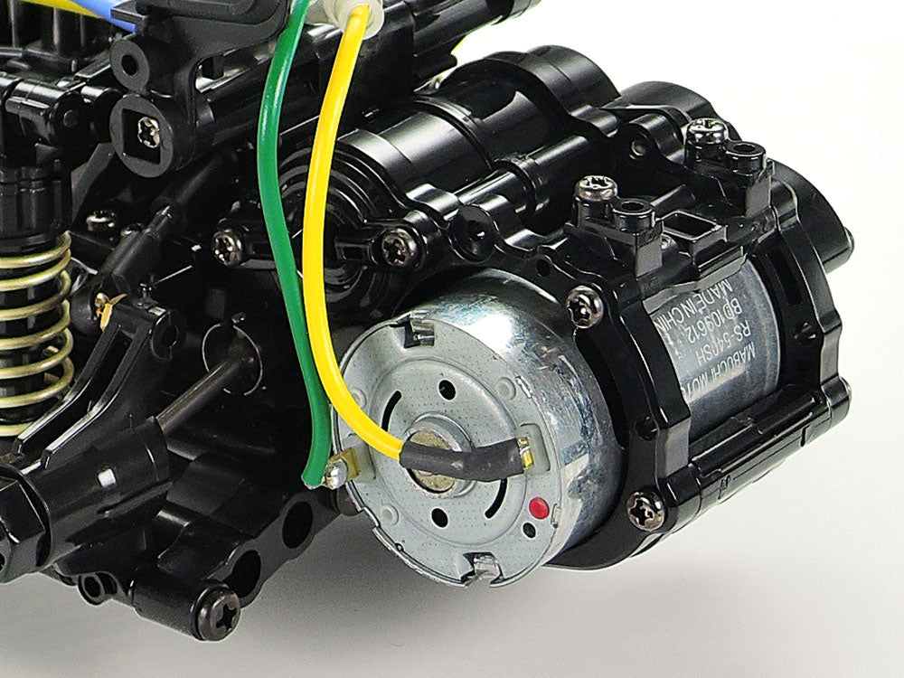 The M-06 chassis features a rear-mounted motor, rear-drive setup and has a longitudinally-mounted battery pack, with R/C equipment positioned on either side for optimum balance and a low center of gravity. 4-wheel double wishbone suspension uses metal-plated wheels, equipped with 60D radial tires at the front and 60D super grip tires at the rear. In addition, a 3-piece steering linkage offers nimble handling response.