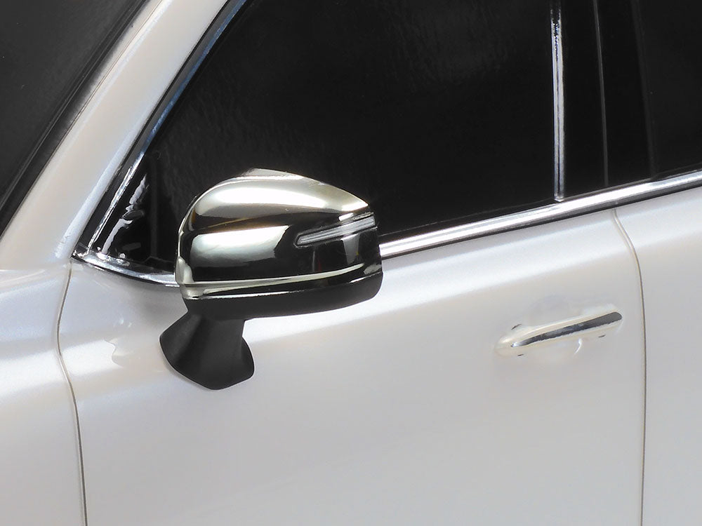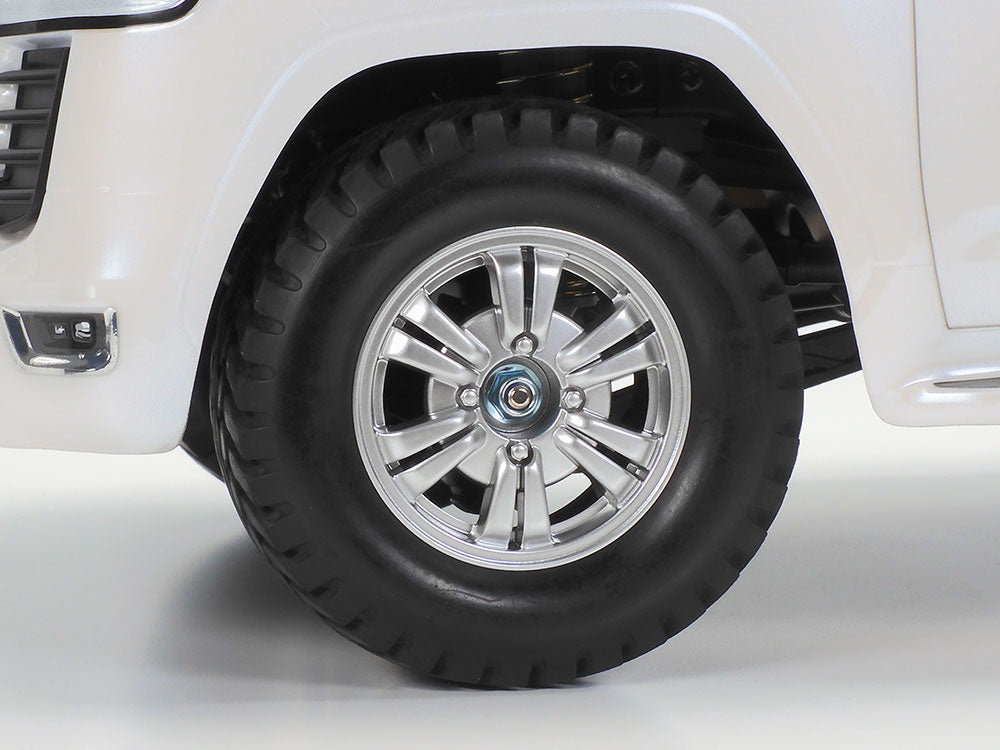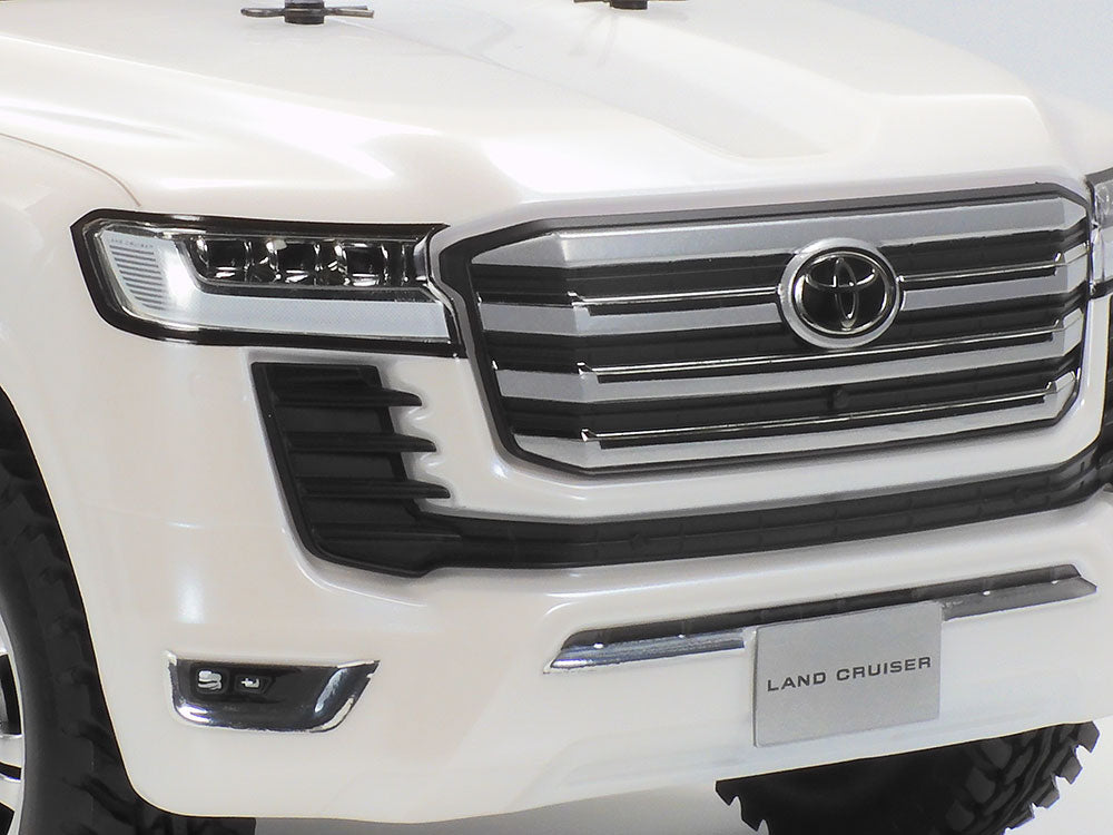 Since the first generation model release in 1951, the Toyota Land Cruiser has been one of the most famous 4WD vehicles in the world. This R/C model assembly kit recreates the Land Cruiser 300 series announced in 2021. The polycarbonate body realistically depicts the eye-catching, dignified form with separate parts to capture the distinctive large front grille's horizontal fins and metal-plated sections. Light case and door mirror components are metal-plated, and door handles and shark fin antenna on roof are rendered by separate parts for more realism. Silver color 12-spoke wheels are paired with block pattern tires.