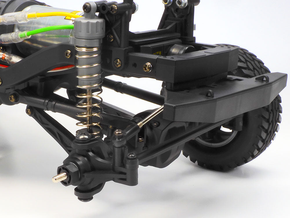 Designed for a wide range of off-road scenes including rocky terrain, the CC-02 chassis' ladder frame is inspired by full-size vehicles and is the base for its superior durability. A 4WD setup employs the motor longitudinally behind the front axle with separated gearbox and transfer case, and propeller shafts transmitting power to the differential gears front and rear. Four-link rigid suspension is employed front and rear, with CVA oil dampers for all-encompassing control, even on tricky rock sections. This model comes with silver color twelve-spoke wheels and grippy block pattern tires.