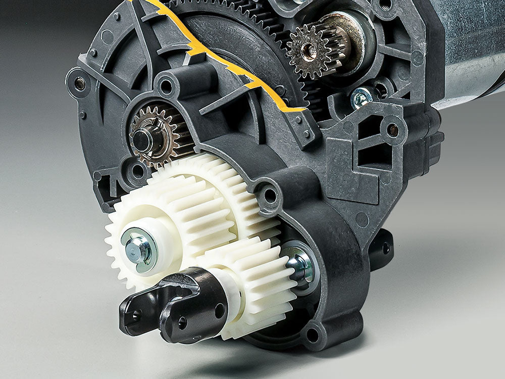 ★Length: 472mm, width: 200mm, height: 192mm ★Wheelbase: 267mm ★Tread: 160mm (front), 163mm (rear) ★Tire width/diameter: 33/90mm (front & rear) ★Ladder frame ★Longitudinal motor, shaft-driven 4WD ★3-bevel differential gears ★4-link rigid suspension (front & rear) & CVA oil dampers ★Gear ratio = 17.33:1 (using kit-standard 16T pinion) ★Type 540 motor ★Electronic Speed Controller (ESC) is sold separately.