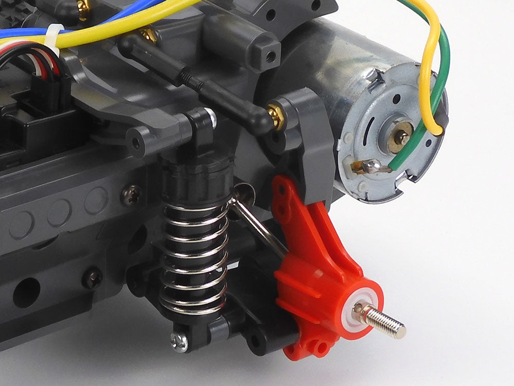 Based around a tough monocoque frame with integrated gearboxes, this compact 4WD chassis gives a thrilling drive whether you take it on road or flat dirt surfaces. It features a rear-mounted motor, with gear-driven rear wheels and a propeller shaft taking power to the front. Both front and rear gearboxes have differential gears. The battery pack location in the chassis center secures excellent balance, while 4-wheel independent double wishbone suspension employs friction dampers. Off-road capable M-05Ra chassis uprights and hub carriers are also included, and dish wheels are paired with rally block tires.