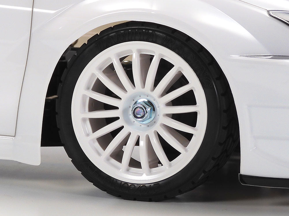 The shaft-driven 4WD TT-02 chassis employs a longitudinal layout with the battery on the left and the motor on the right, to give excellent stability. In addition, it features identical left and right suspension arms and uprights for ease of assembly, plus easy-to-maintain gearboxes. It is a highly adaptable chassis, as it offers 2 different wheelbases, 2 ground clearance settings and 2 tread set-ups in addition to a range of 10 possible gear ratios. It is not short on looks either, with brake disc-shaped wheel hubs and stylish front bumper supports. Silver color fin-spoke wheels use semi-pneumatic racing radial tires.