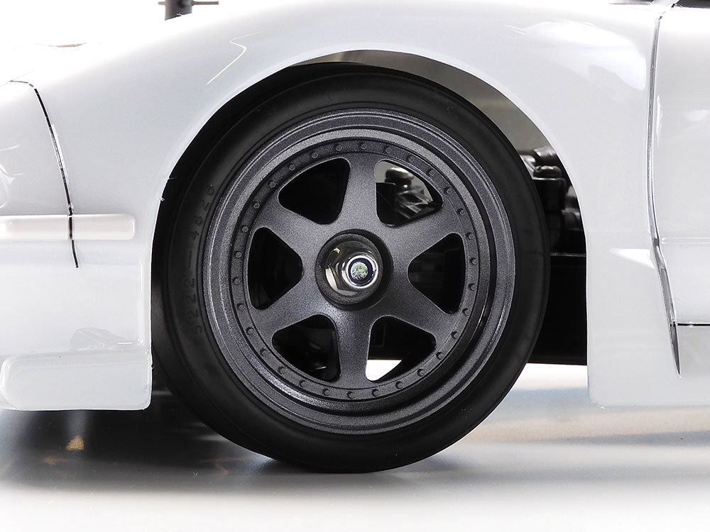 The shaft-driven 4WD TT-02 chassis employs a longitudinal layout with the battery on the left and the motor on the right, to give excellent stability. In addition, it features identical left and right suspension arms and uprights for ease of assembly, plus easy-to-maintain gearboxes. It is a highly adaptable chassis, as it offers 2 different wheelbases, 2 ground clearance settings and 2 tread set-ups in addition to a range of 10 possible gear ratios. It is not short on looks either, with brake disc-shaped wheel hubs and stylish front bumper supports. Dark gun metal color 6-spoke wheels use semi-pneumatic slick tires.