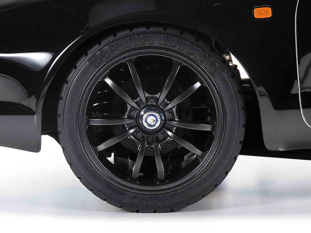The shaft-driven 4WD TT-02 chassis employs a longitudinal layout with the battery on the left and the motor on the right, to give excellent stability. In addition, it features identical left and right suspension arms and uprights for ease of assembly, plus easy-to-maintain gearboxes. It is a highly adaptable chassis, as it offers 2 different wheelbases, 2 ground clearance settings and 2 tread set-ups in addition to a range of 10 possible gear ratios. It is not short on looks either, with brake disc-shaped wheel hubs and stylish front bumper supports. Gun metal color 10-spoke wheels use semi-pneumatic treaded tires.